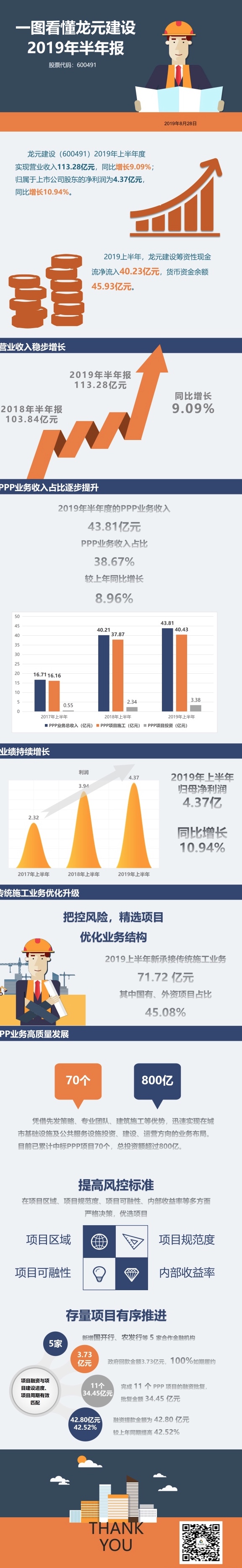 8月27日晚間,龍?jiān)瘓F(tuán)披露2019年半年度報(bào)告。報(bào)告期內(nèi),公司營(yíng)業(yè)收入實(shí)現(xiàn)113.28億元,同比增長(zhǎng)9.09%。其中,PPP業(yè)務(wù)收入為43.81億元,占當(dāng)期合并營(yíng)業(yè)總收入的比例為38.67%,PPP業(yè)務(wù)收入較上年同比增長(zhǎng)8.96%。歸屬于上市公司股東的凈利潤(rùn)4.37億元,比上年同期增長(zhǎng)10.94%。