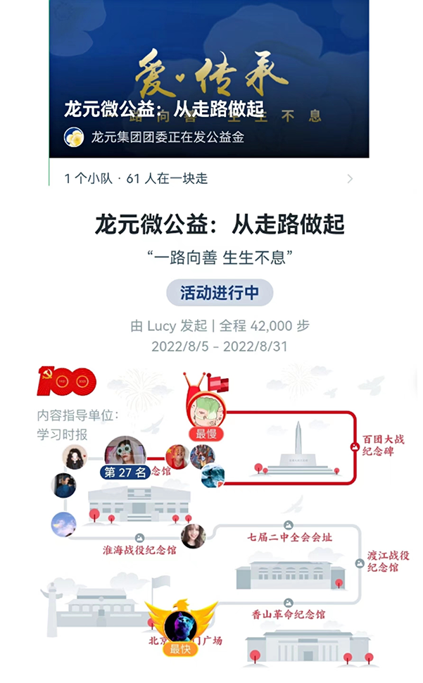 8月5日,集團(tuán)團(tuán)委發(fā)起“龍?jiān)⒐妫簭淖呗烽_(kāi)始”公益捐步活動(dòng),重走紅色旅游地圖。此項(xiàng)活動(dòng)將黨史學(xué)習(xí)教育、互聯(lián)網(wǎng)公益及企業(yè)文化緊密結(jié)合,創(chuàng)新活動(dòng)形式,鼓勵(lì)龍?jiān)獔F(tuán)員青年積極參與。捐步活動(dòng)所產(chǎn)生的所有善款將專(zhuān)項(xiàng)用于“一億顆梭梭樹(shù)”項(xiàng)目,在阿拉善盟地區(qū)種下綠植,為助力“碳中和”貢獻(xiàn)龍?jiān)啻毫α俊?/span>