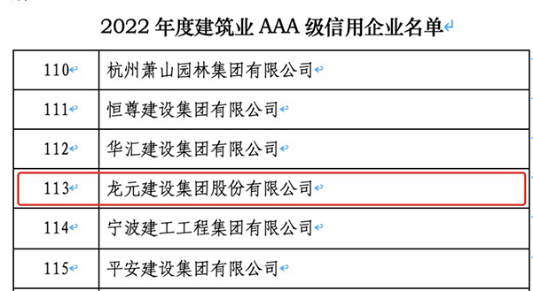 龍元建設集團獲評2022年度建筑業AAA級信用企業