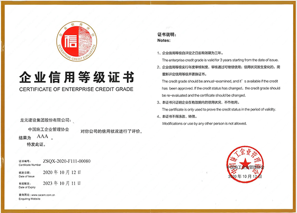 此前,龍元建設集團曾多次獲得工程建設企業社會信用評價AAA級企業、浙江省AAA級“守合同重信用”企業等榮譽。此次獲評2022年度建筑業AAA級信用企業,是對公司實力和信譽的再度認可。