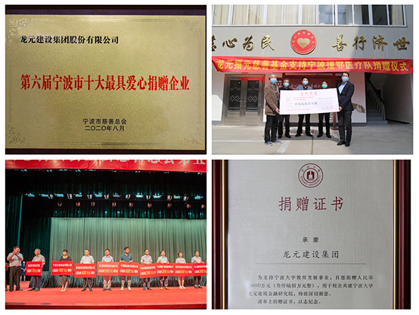 此外,集團還積極參與社會公益活動,主動承擔社會責(zé)任,在愛心助學(xué)、扶貧幫困、社會捐贈、疫情防控等方面積極捐款捐物。2007年起,集團公司連續(xù)15年在象山縣慈善總會建立幫困基金。今年,集團與象山縣慈善總會攜手,繼續(xù)設(shè)立為期10年的“龍元慈善濟困”冠名基金,積極參與家鄉(xiāng)的經(jīng)濟社會建設(shè)。2020年起,集團向?qū)幉ù髮W(xué)捐資打造寧波大學(xué)龍元建筑金融研究院,為家鄉(xiāng)建筑業(yè)的轉(zhuǎn)型升級培養(yǎng)人才以及輸出高質(zhì)量的研究成果。2020年新冠疫情期間捐贈用于援鄂醫(yī)療醫(yī)護人員,致敬“逆行者”。集團還榮獲第六屆寧波市“十大最具愛心捐贈企業(yè)”、第六屆“寧波慈善獎”捐贈企業(yè)獎。